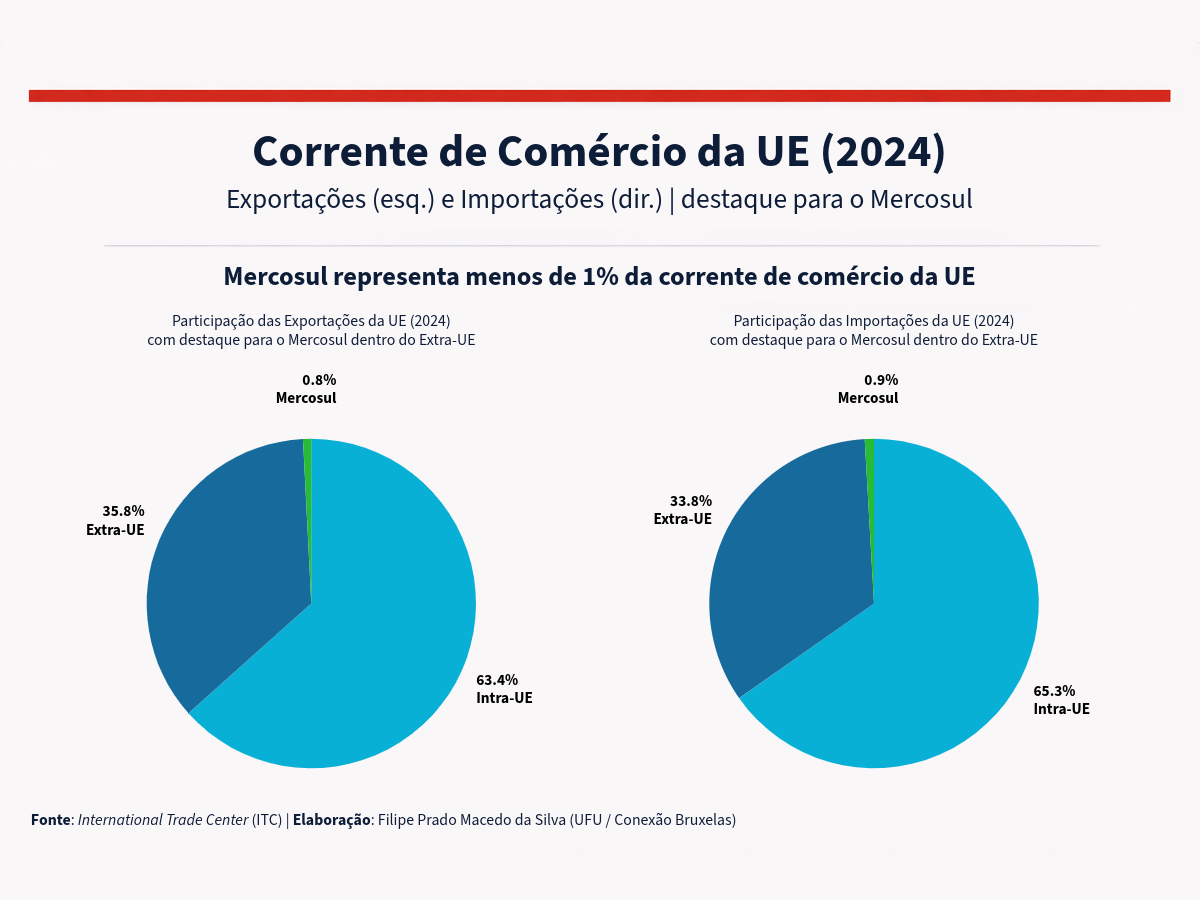 Dados do International Trade Center (ITC) para o período de 2015 a 2024 indicam que, do ponto de vista europeu, o comércio com o Mercosul permanece relativamente limitado: as importações dos sul-americanos representaram, em média, 0,93% do total comprado pela UE, enquanto as exportações para o Mercosul corresponderam a cerca de 0,85%.