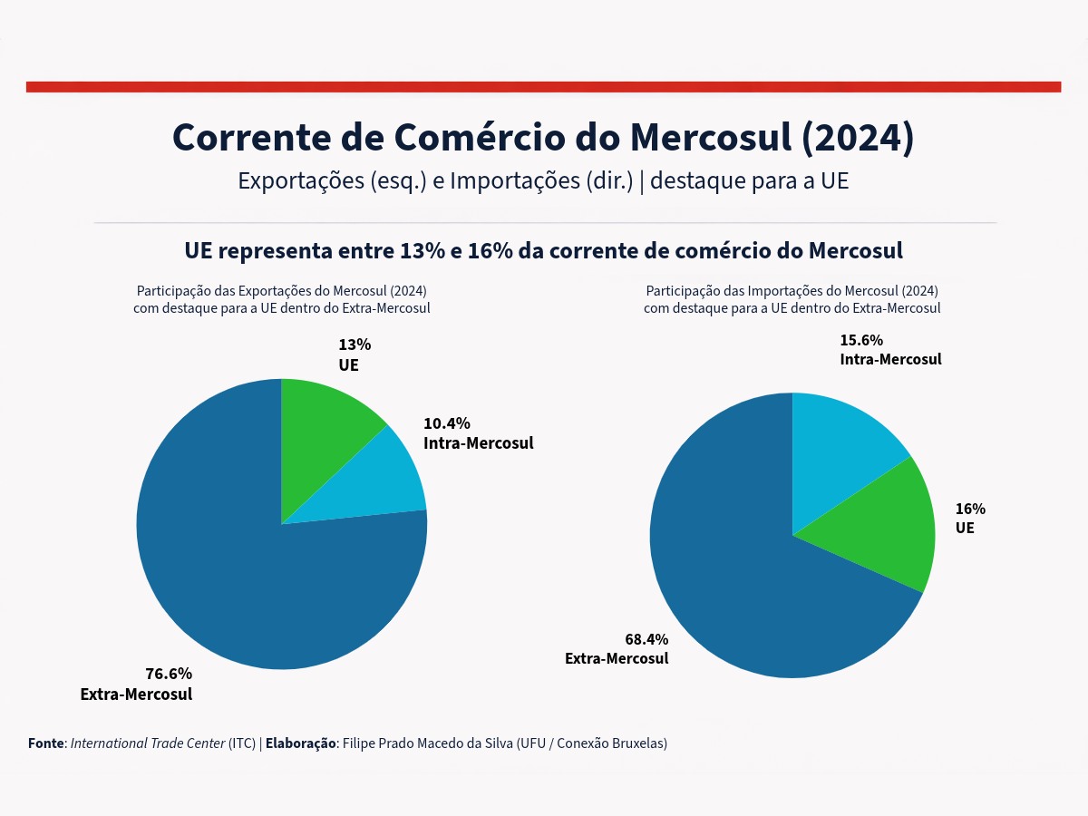 Em 2024, o Mercosul registrou importações de US$ 368,3 bilhões e exportações de US$ 451,8 bilhões. Nessa corrente de comércio, a UE respondeu por 16% das importações sul-americanas (US$ 59 bilhões) e por 13% dos destinos das exportações (US$ 60 bilhões).